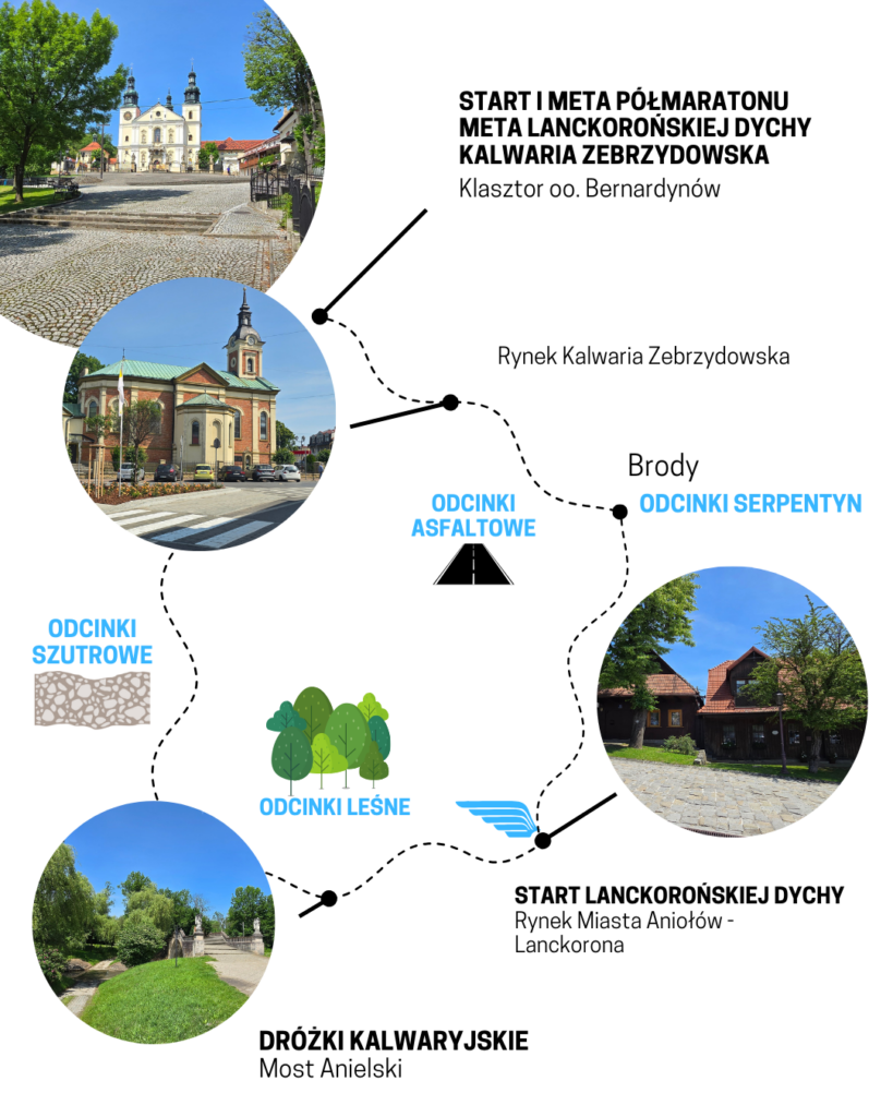 Bieg Aniołów prowadzi przez wyjątkowe miejsca Kalwarii Zebrzydowskiej i Lanckorony – regionu o niezwykłym znaczeniu historycznym, przyrodniczym i duchowym. Trasa biegnie od malowniczego Rynku w Lanckoronie, przez fragmenty Dróżek Kalwaryjskich, aż po okolice klasztoru w Kalwarii Zebrzydowskiej.